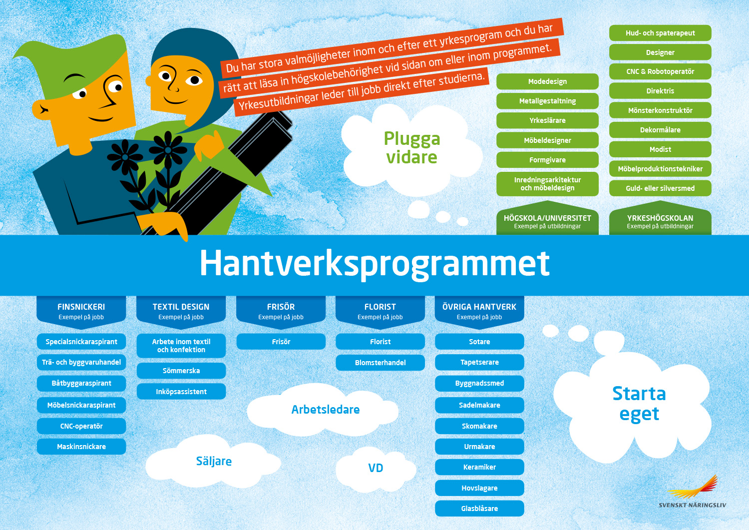 Hantverksprogrammet vänder sig till dig som vill använda dina händer och arbeta med ett kreativt hantverksyrke. Du kan välja hantverk inom många olika branscher. Du kan börja jobba direkt efter utbildningen eller fortsätta studera inom yrkeshögskolan. Du kan också välja att läsa kurser för att studera vidare på högskolan.