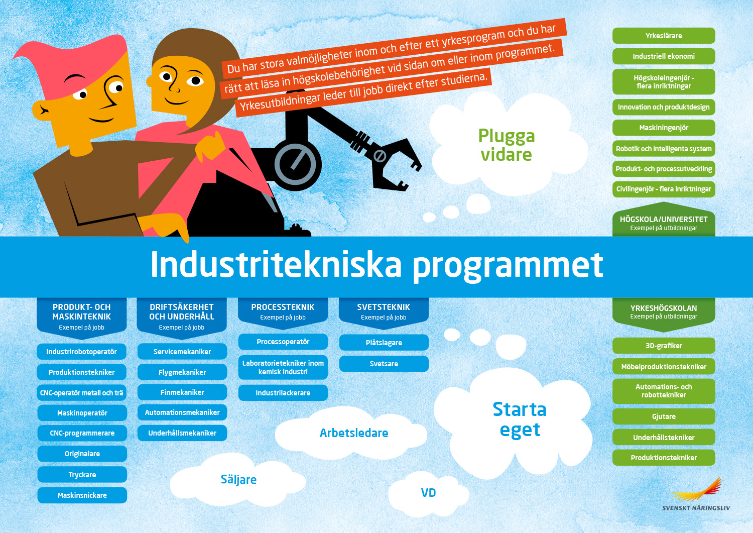 Industritekniska programmet vänder sig till dig som vill arbeta med till exempel produktframställning, driftsäkerhet och svetsning inom teknisk industri. Du får lära dig att hantera tekniska system. Du kan börja jobba direkt efter utbildningen eller fortsätta studera inom yrkeshögskolan. Du kan också välja att läsa kurser för att studera vidare på högskolan.